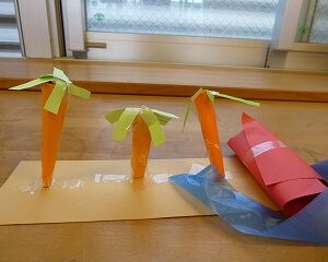 今日はシンプルに「新聞紙」「はぎれの画用紙」「毛糸」「ストロー」など少しの材料で・・・