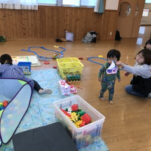 遊戯室では、電車🚃、ままごと🍓、ブロック🤖などたくさんのおもちゃを使って仲良く遊んでいます。