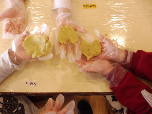 食育の日「すずらん組さん(年中)さつまいも餅作ったよ」