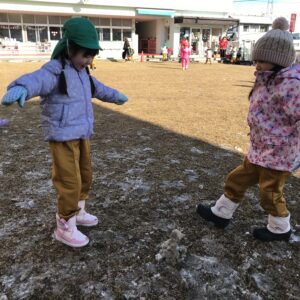 先週、園庭にうっすらと雪があるのを見つけた子ども達は大はしゃぎ。