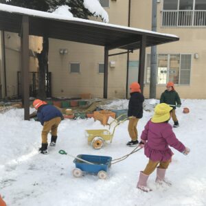 登園してきた子どもたちは、「今日は雪遊びできる?」「早く外に行きたい!」と、とっても楽しみにしている様子!