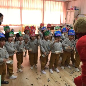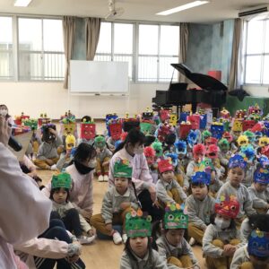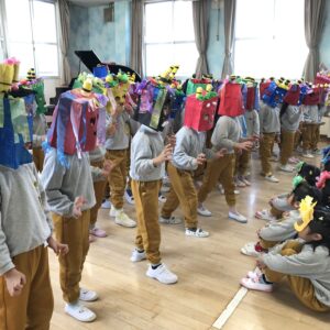 子ども達はそれぞれに作った鬼のお面を付けて遊戯室に集まりました。
