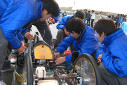 この競技はHONDA製50CCエンジンを使用し1リットルのガソリンでどの位の距離を走れるのかを競います、少しでも長い距離を走るためにエンジンの改造、空力を考えたカウリングの作成、ドライバーの体重まで考えた軽量化等、日々、部員のアイデアを元に検討し活動をしています。 全国大会は毎年栃木県の「ツインリンクもてぎ」で行われています。今年は去年までの実績をふまえ改善しさらなる記録を更新したいと思います。 目指せ1000km!